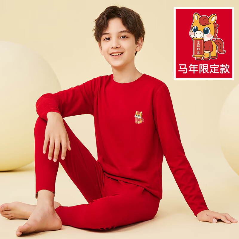 *甄选新疆长绒棉,A类标准,双面蓄热暖绒,亲肤柔软,柔软贴肤,马年限定,好运无限~【59.9包邮】猫人(MiiOW)儿童纯棉马年限定本命年保暖内衣套装