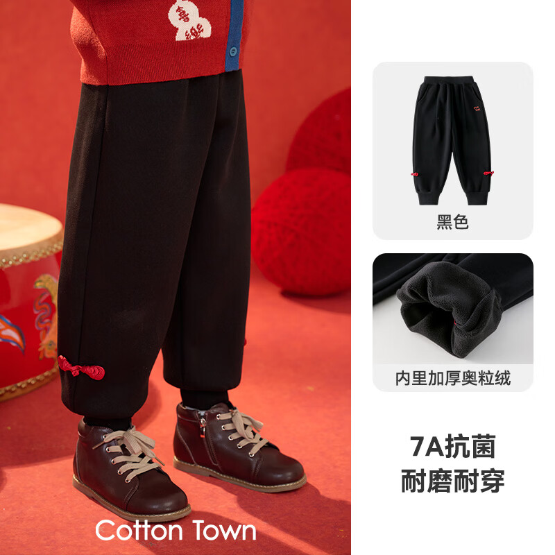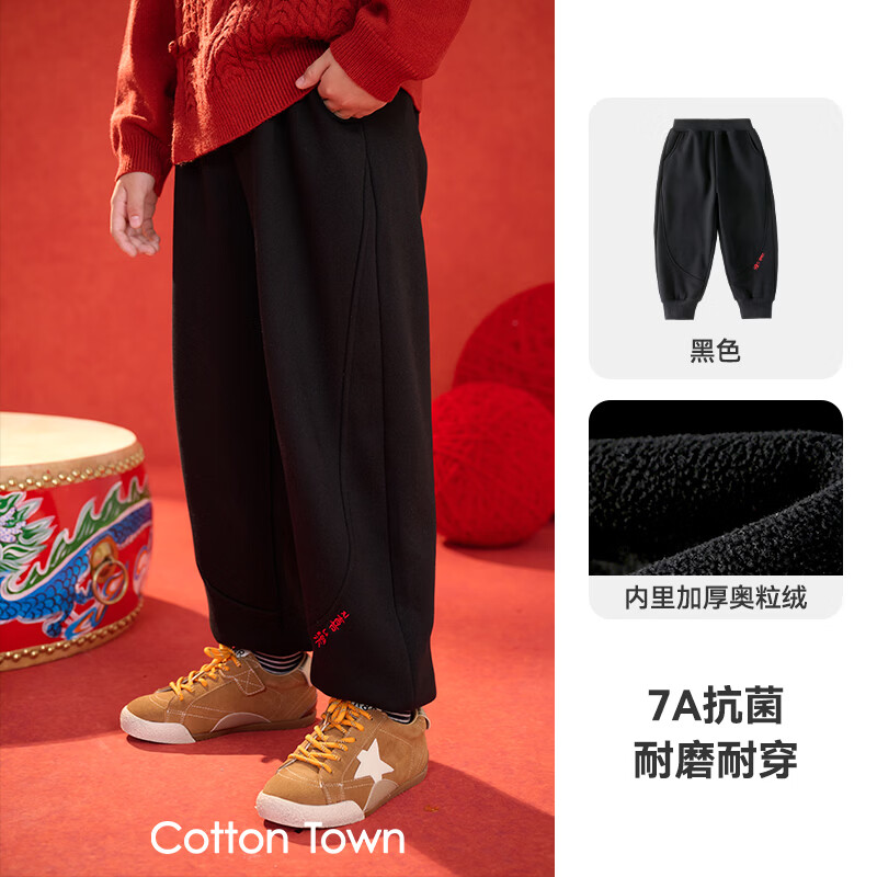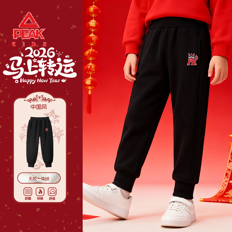 唐狮(TonLion)童装儿童加绒裤子2026新年款中大童拜年长裤男女童保暖运动裤 黑色03半面舞狮K 160160(高150-160重80- 100