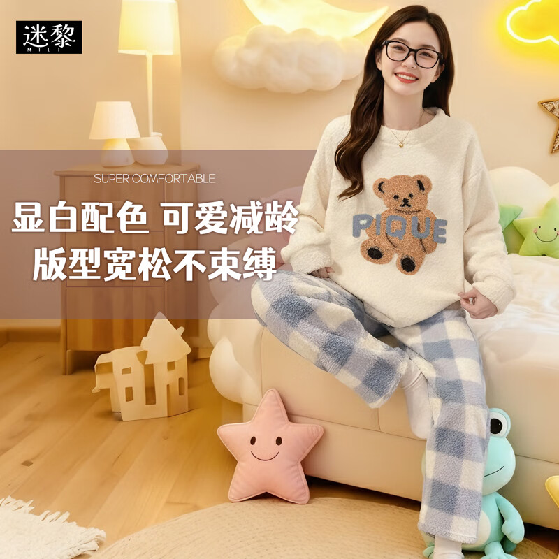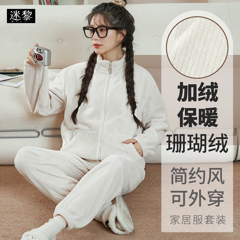 京东商城,品质无忧,万里挑一!内外橙标情侣千层绒圆领高领睡衣家居服套装可外穿保暖半边绒 女士高领-桦木米 L (女120-130斤,男130-150斤)