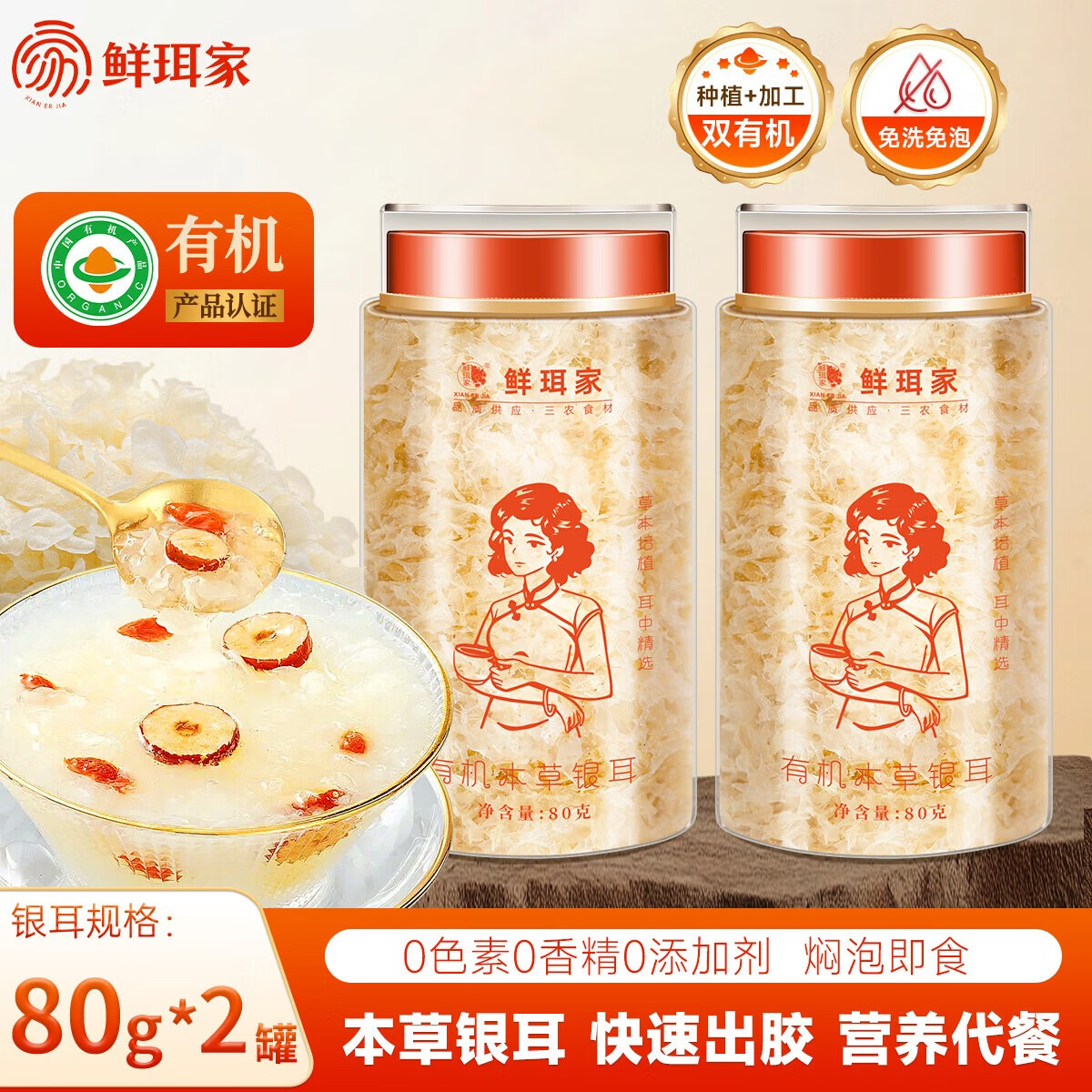 *天然有机耳中珍品,胶质满满,营养价值高,免洗免泡,焖煮即食,送礼/自食都很不错!【补贴价49.9包邮】鲜珥家 有机本草银耳礼盒 80g*2罐+伴侣+焖烧杯