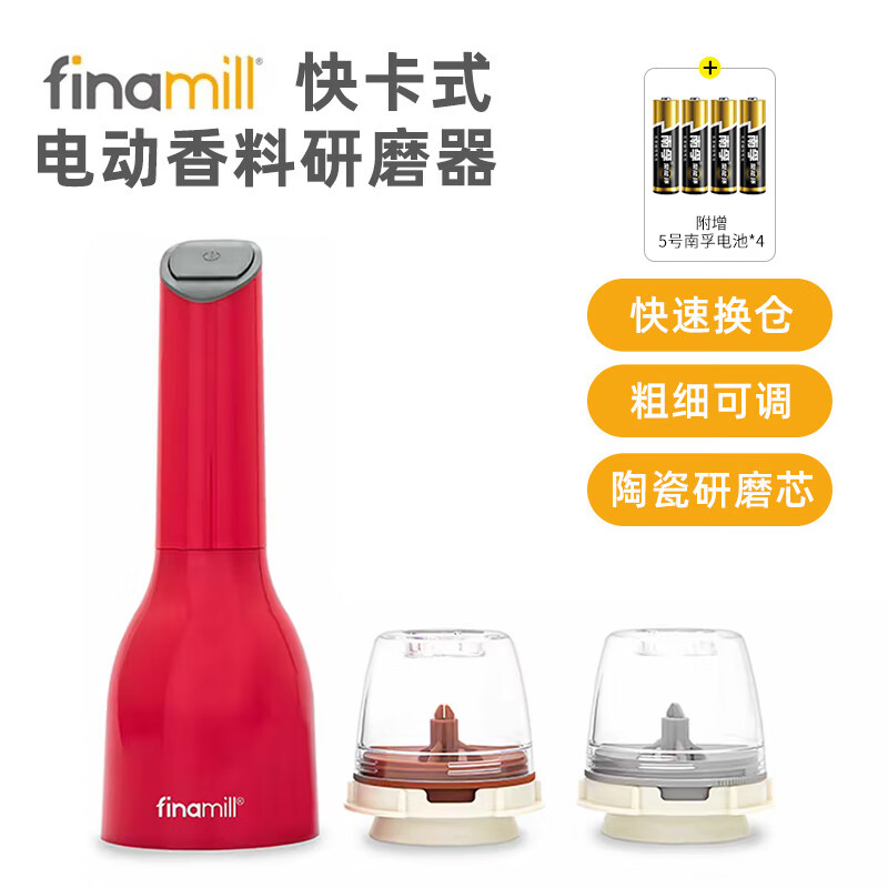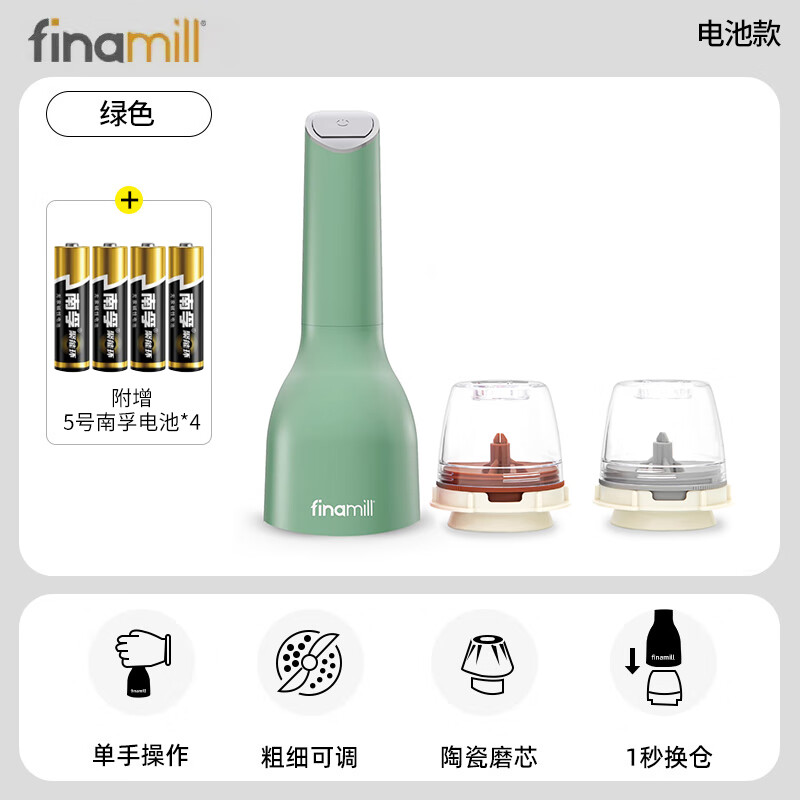 京东商城,品质无忧,万里挑一!FINAMILL快卡式电动香料研磨器 厨房家用 海盐黑胡椒研磨器 【电池款】绿色机器+2料仓+1托盘