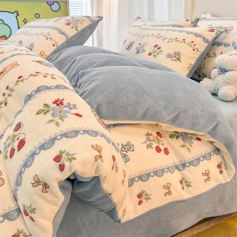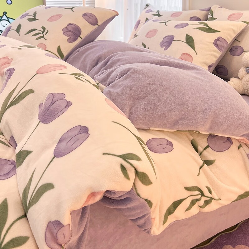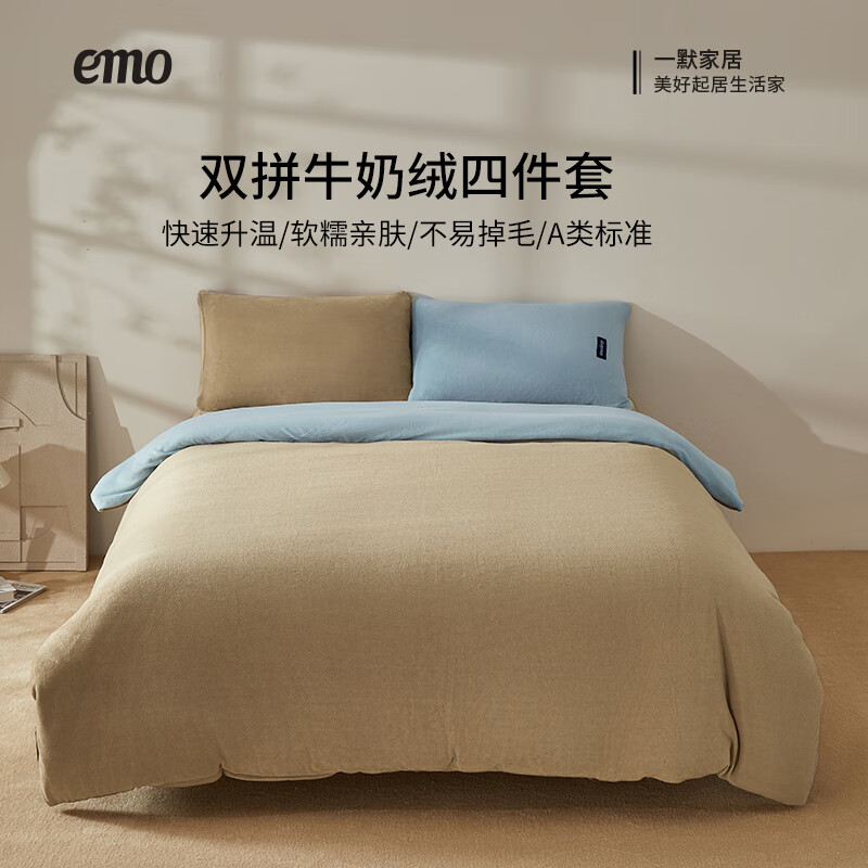 雅鹿纯色秋冬季牛奶绒保暖四件套珊瑚绒床上绒加厚法兰绒被套三件套 米杏+茶咖【高克重牛奶绒 厚实保暖】 1.8m四件套 床单款 (被套200*230cm)