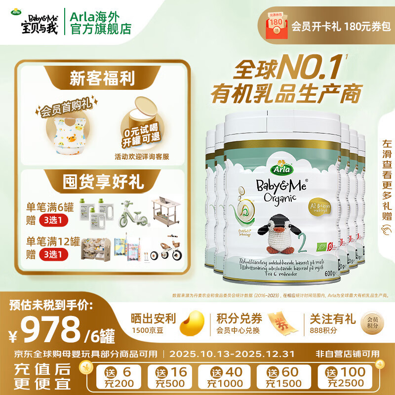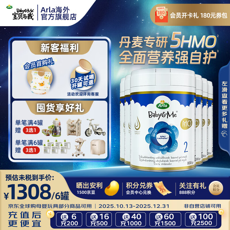 京东全球购此款目前活动售价1308元,下单领取满1199减60元优惠券,下单1件,实付低至1248元六罐,折合每罐208元。Arla宝贝与我丹麦5HMO极光蓝罐幼儿奶粉3段800g*6罐