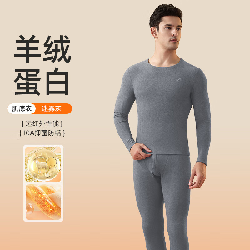 猫人(MiiOW)女士保暖内衣女秋冬羊毛蚕丝情侣透气润肤圆领无痕秋衣秋裤套装 麻灰-男款 (羊绒蚕丝) XL (建议120-150斤)