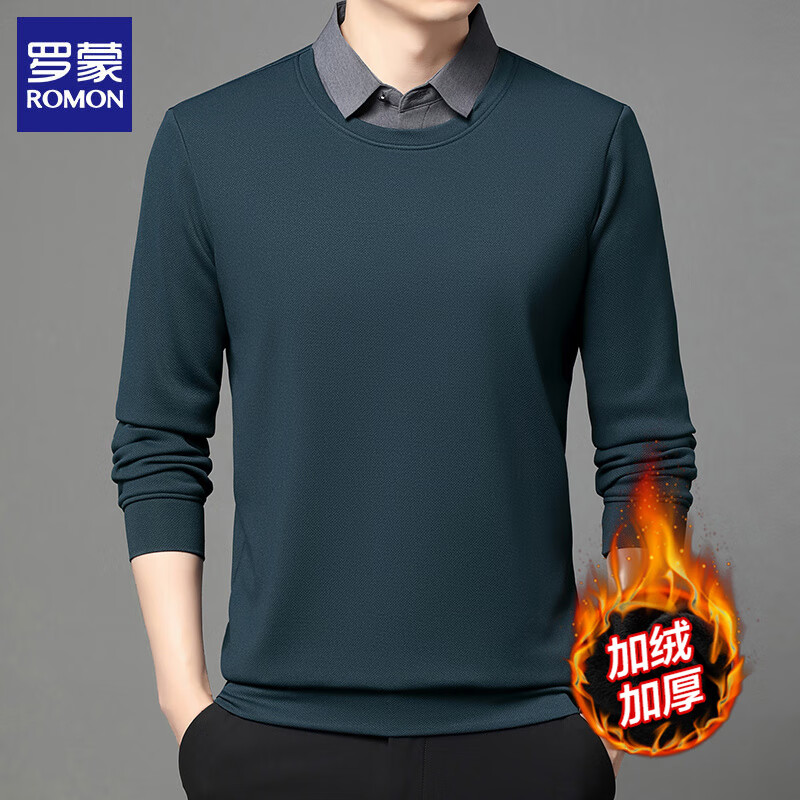罗蒙(ROMON)加绒加厚含羊毛假两件针织衫男士冬季中青年保暖毛衣针织打底衫 7Z499181上青 【含羊毛】 L (170)