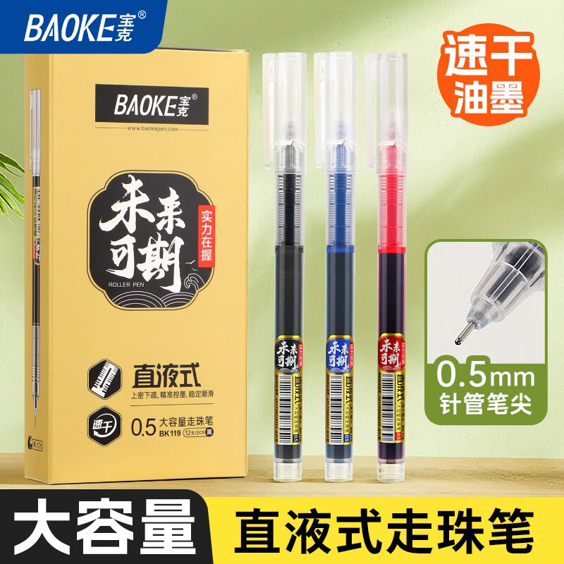 宝克走珠中性笔0.5mm黑色全针管速干走珠笔彩色手账笔学生作业考试用水笔办公签字笔直液式大容量 包邮 黑色 速干直液式 BK119 12支/盒【囤货批发价】
