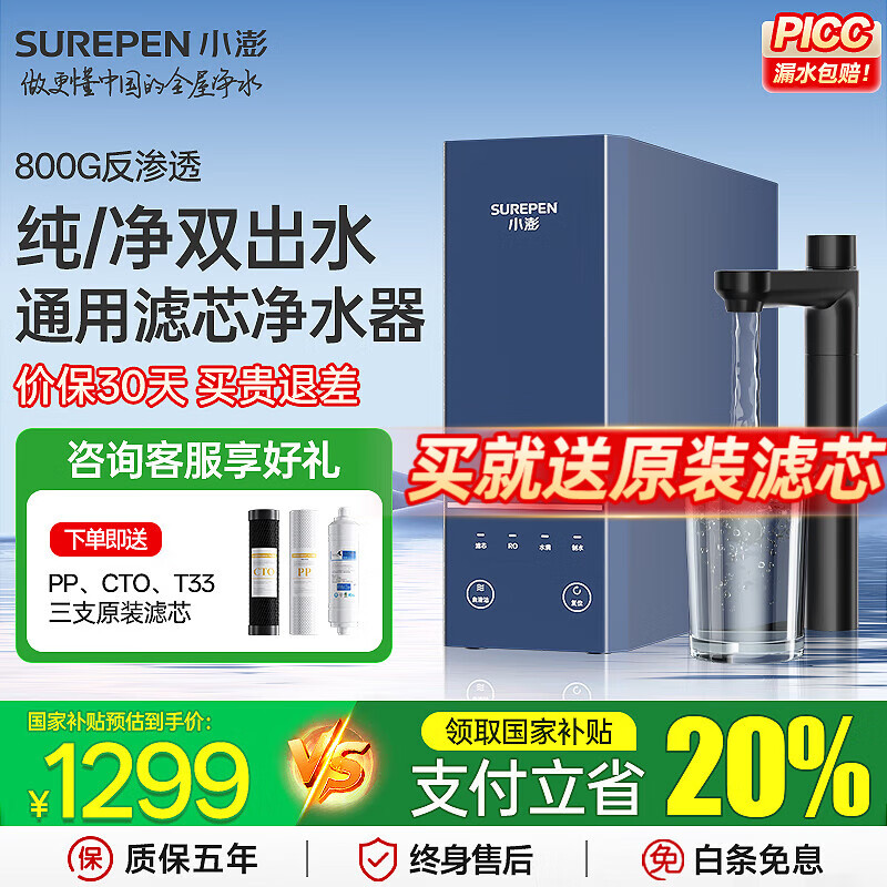 美菱(MeiLing)净水器家用直饮机一体机自来水过滤器厨房专用ro反渗透净水器1200G流速0陈水0阻垢纯净双出水 【超值净水即热三件套】前置过滤器+管线机+净水器