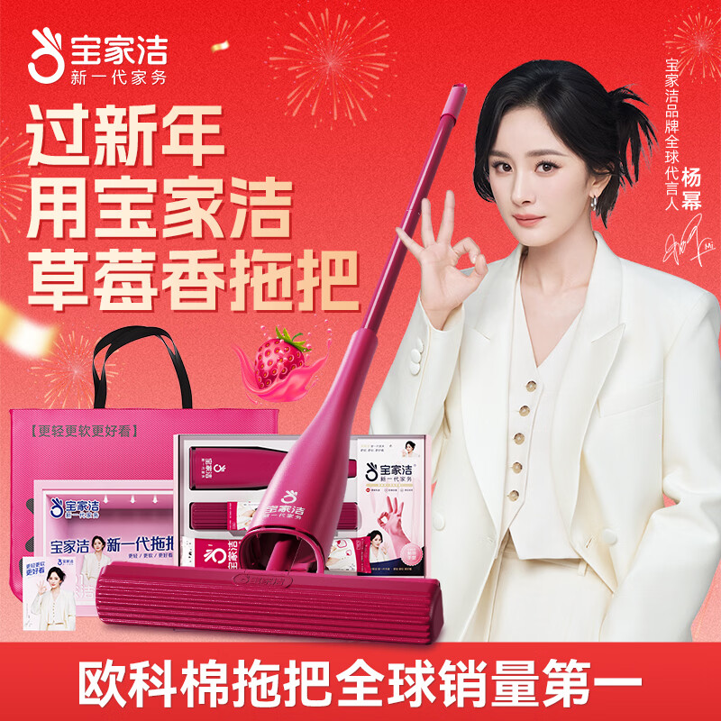 宝家洁【杨幂同款】胶棉拖把吸水海绵对折拖把一拖净免手洗2025礼盒 【杨幂冬日限定礼盒】草莓香拖把-升级一键换头