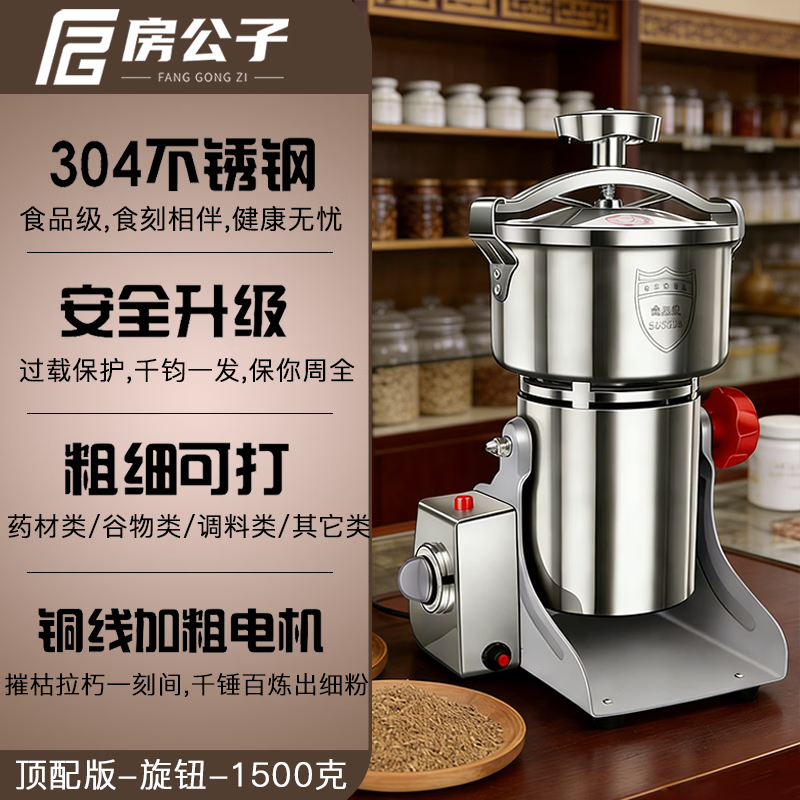 房公子中药材粉碎机商用小型家用打粉机超细研磨机五谷杂粮磨粉机药房同款磨粉机304不锈钢大料花椒三七 【顶配款】旋钮304食品级不锈钢1500g铜线电机