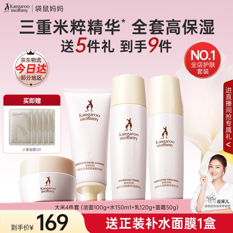 京东商城,品质无忧,万里挑一!袋鼠妈妈光感透亮水乳霜套装护肤品肌肤焕亮发光改善暗沉礼盒送女友礼物 【5秒完妆】5件套含素颜霜
