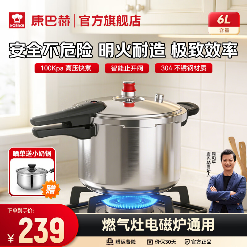 康巴赫(KOBACH) 高压锅304不锈钢家用高压锅燃气通用大容量加厚防爆快煮压力锅 【适合4-6人】304不锈钢材质 22cm 6L