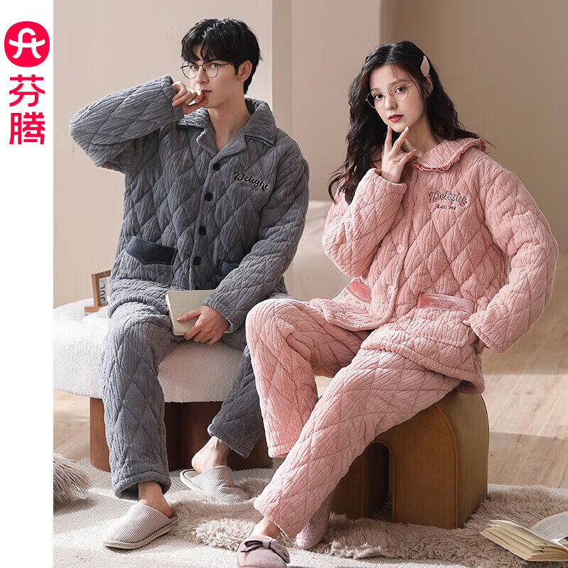 芬腾【清仓】情侣珊瑚绒夹棉睡衣女士冬季三层加厚男抗静电家居服套装 FJ25950375粉色【单女款】 XL 建议:女124-142,男146-165斤